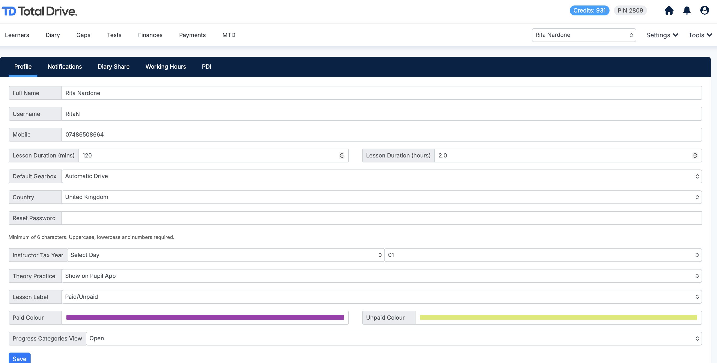 To set up lesson reminders, choose how many days in advance the reminder should be sent—1, 2, or 3 days before the lesson. You can also personalise the reminder message that your pupils will receive. Please press save after making any changes.