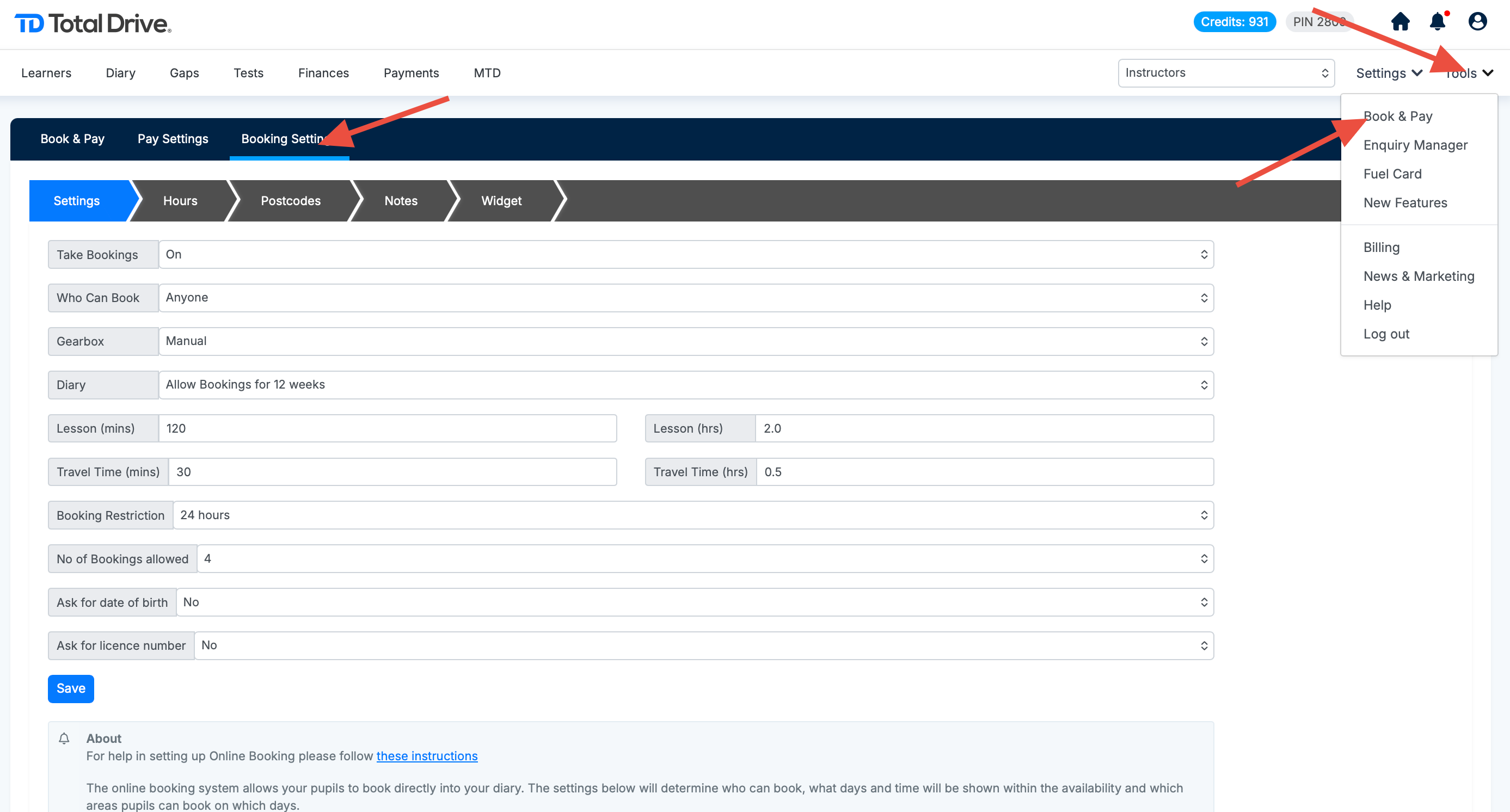 Once you have enabled online booking head over to the Tools menu again and choose Book & Pay, you will see 3 tabs, select the Booking Setting Tab