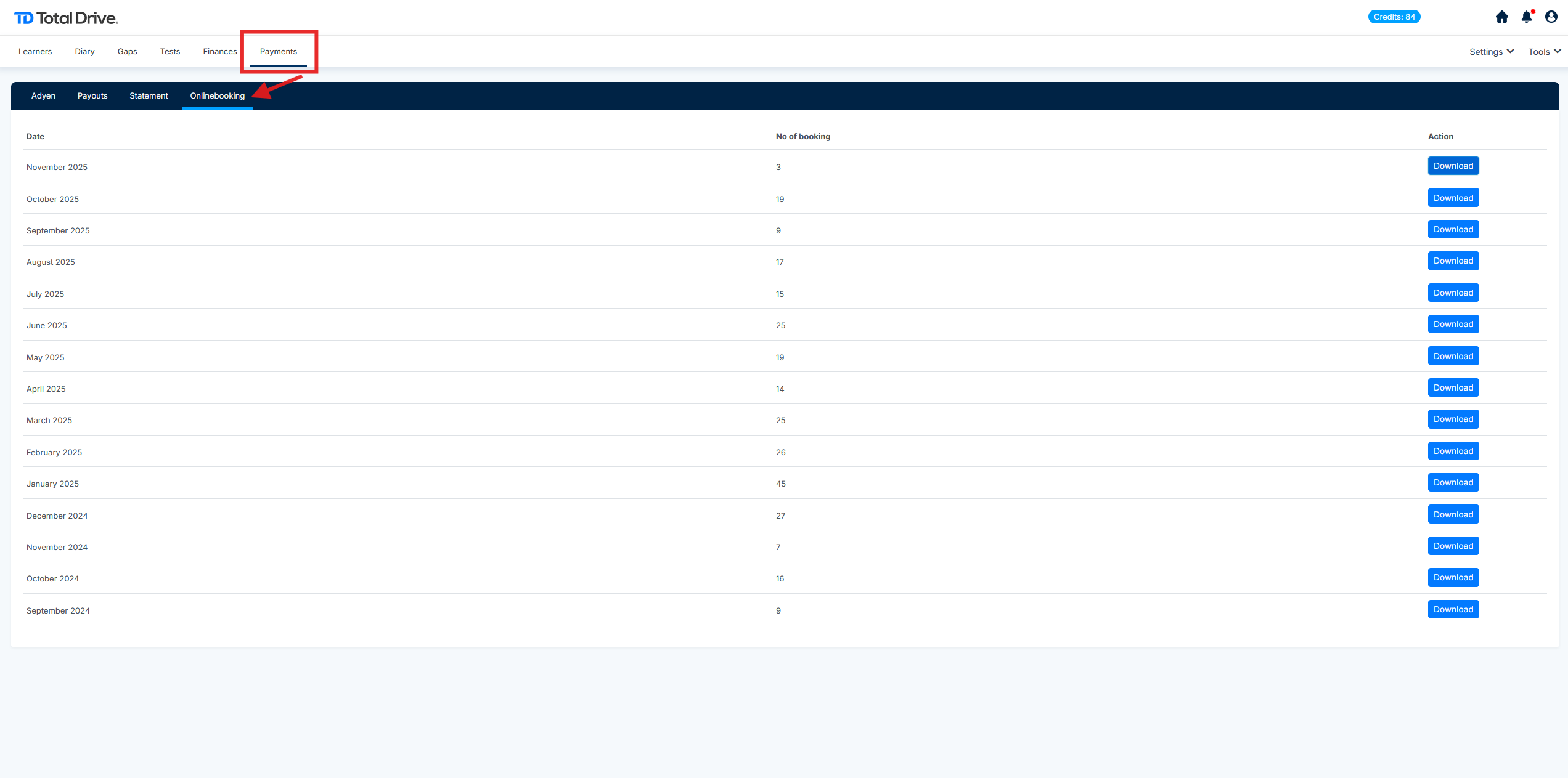 Look for the monthly report you wish to view and select "Download" under Action to the right of the page. A .pdf file will be downloaded showing you the monthly activity for your Driving School's Online Booking activity.
