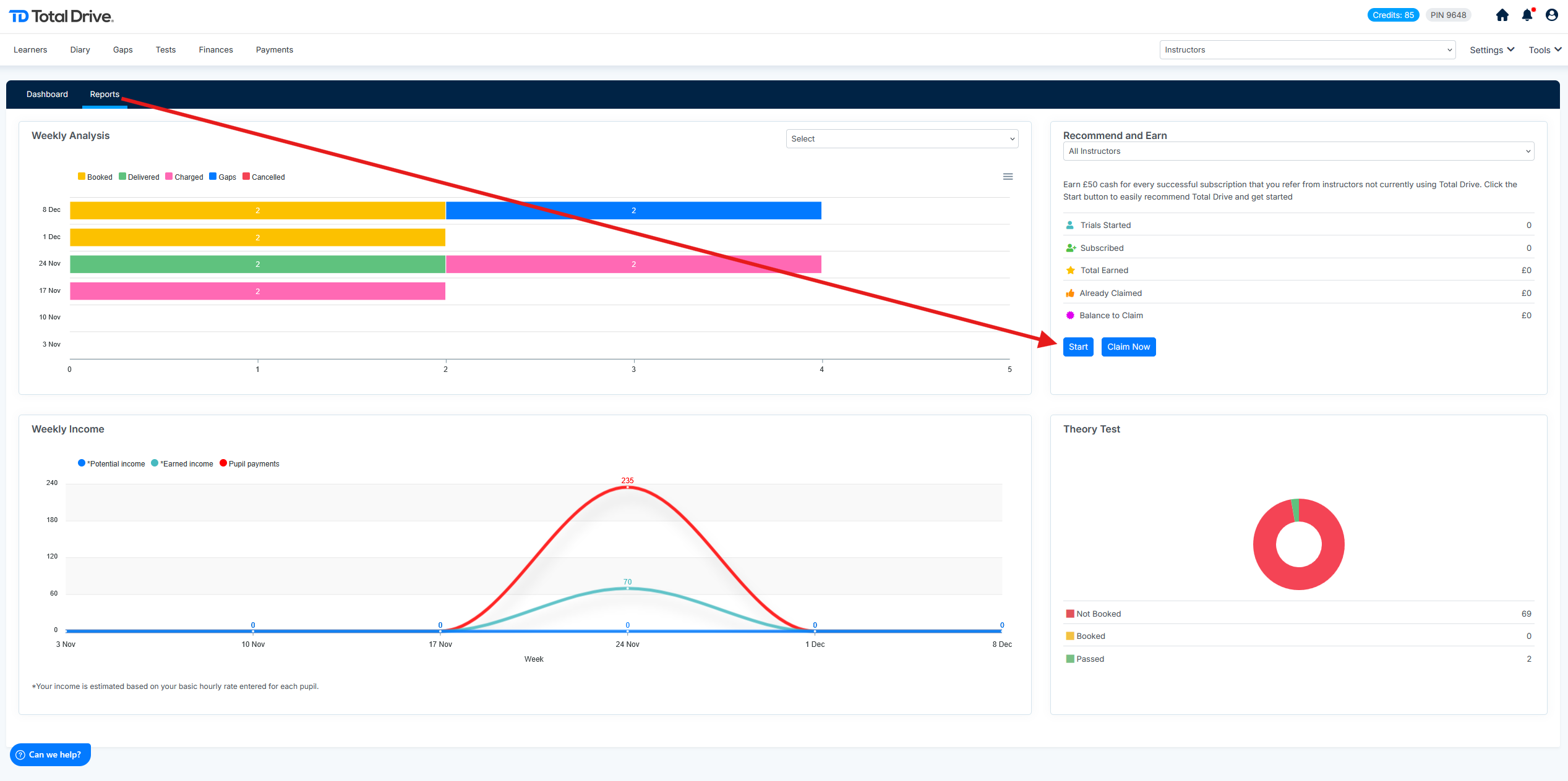 From the Reports screen, click "Start" located under Recommend and Earn to the right of the screen.