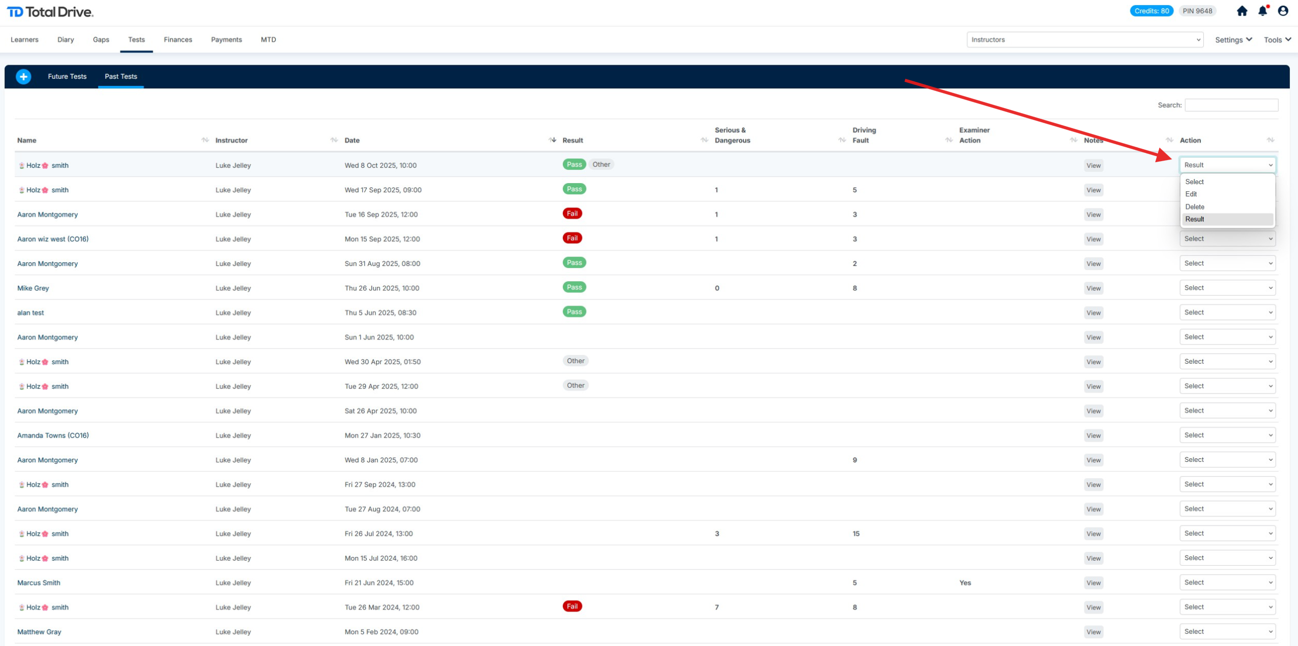 From here locate the pupil you wish to add the test result for, select the Action on the far right. You can edit/delete or add the results of the test.
