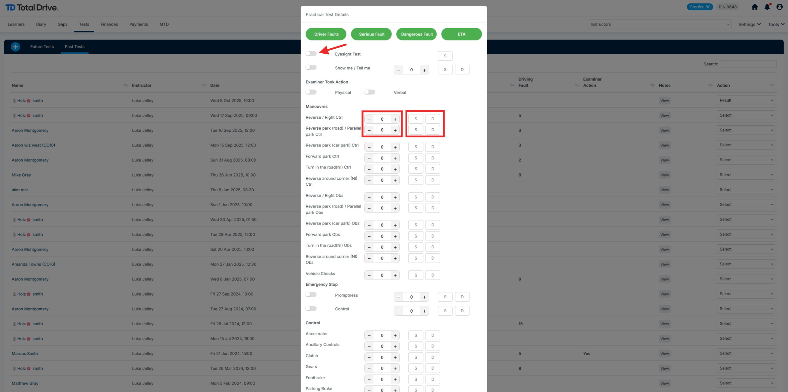 The Key at the top shows in Green to aid with marking, these will change colour as you add to the form ETA will be identified if Examiner Took Action. You can toggle options on should you wish to report on this, add the number of driving faults using the + & - and additionally specify if they are Serious Faults or Dangerous Faults.