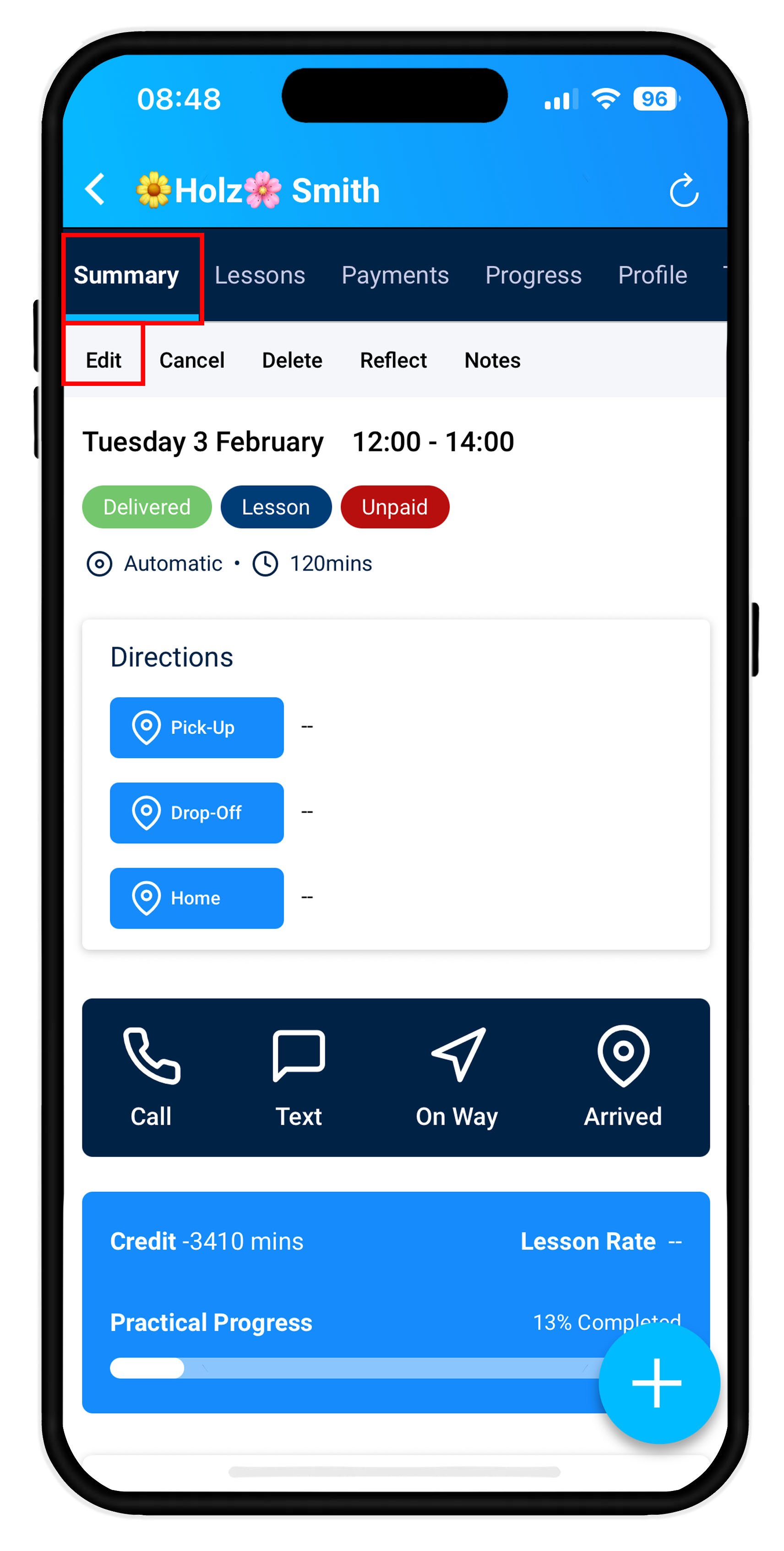 This will open the Summary screen. Select Edit to amend the details for this lesson.