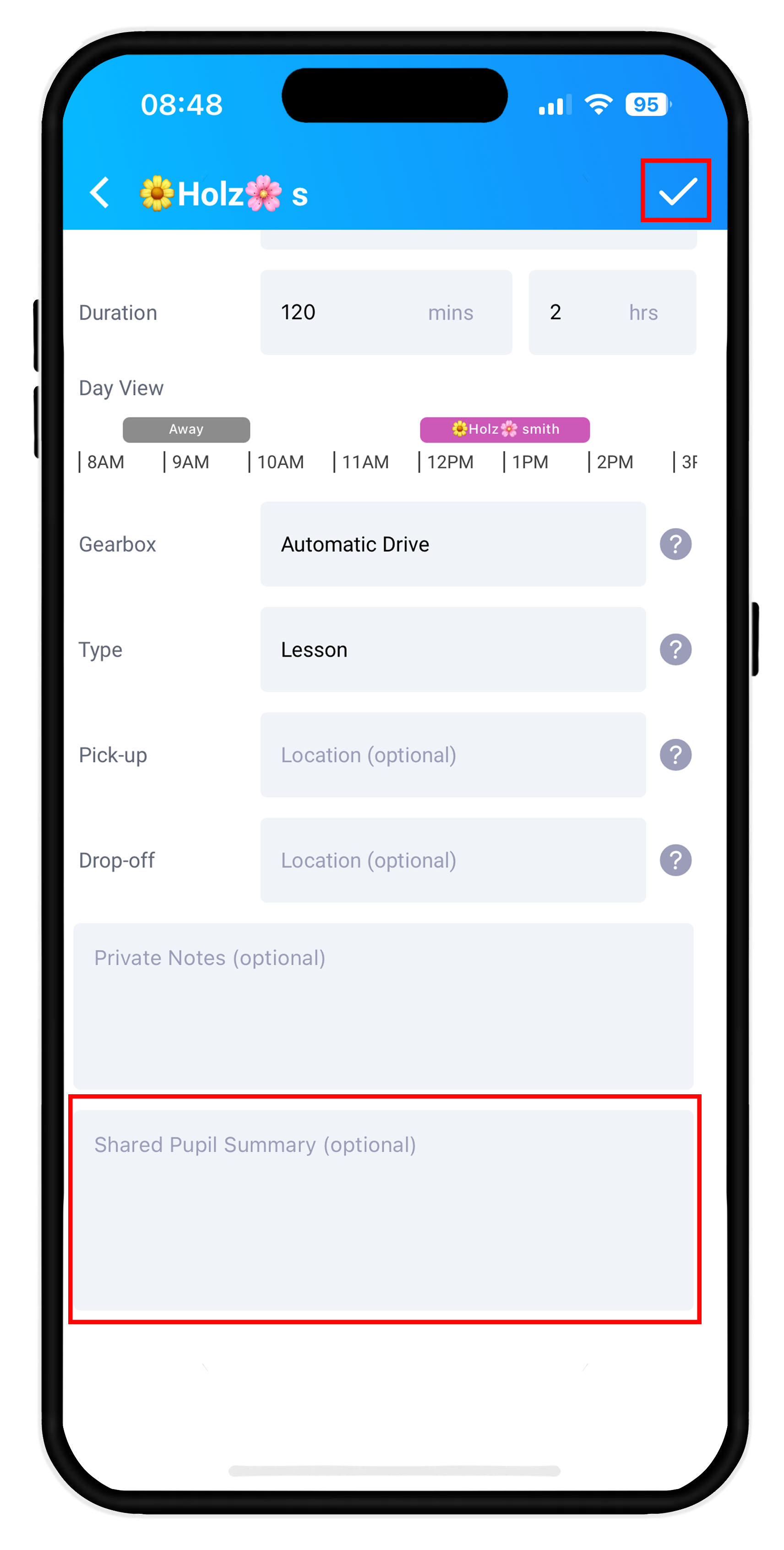 From this screen you can add the write up for the lesson, shared pupil summary which is visible to both instructor and pupil and pupil private notes that only the instructor can see. Both are optional fields so you can come back to this summary at any point to update.